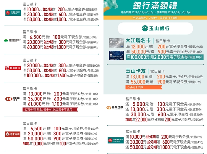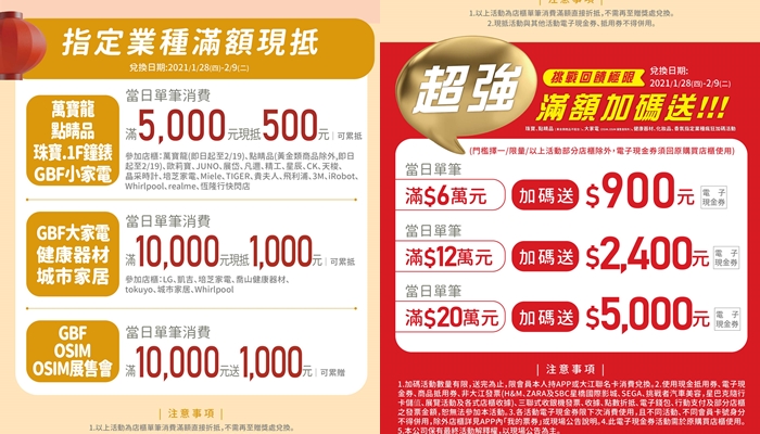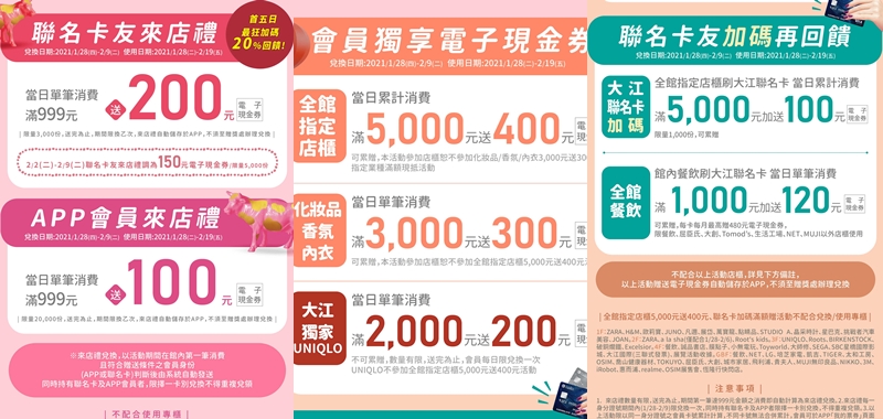 大江購物中心這次為了2021賀歲慶也舉辦了超多活動,各種業種或是信用卡等等都有不一樣的組合優惠或是折價活動。
