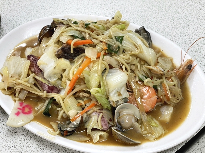 | 海鮮炒麵的料超級豐富,各種海鮮都有,我覺得滿不錯的,海鮮當然沒話說,就是新鮮,但是唯一我覺得如果麵量可以再多一點會比較好,因為麵的部分裝不滿一小碗,麵量真的非常少!(不知道可不可以加麵?) |