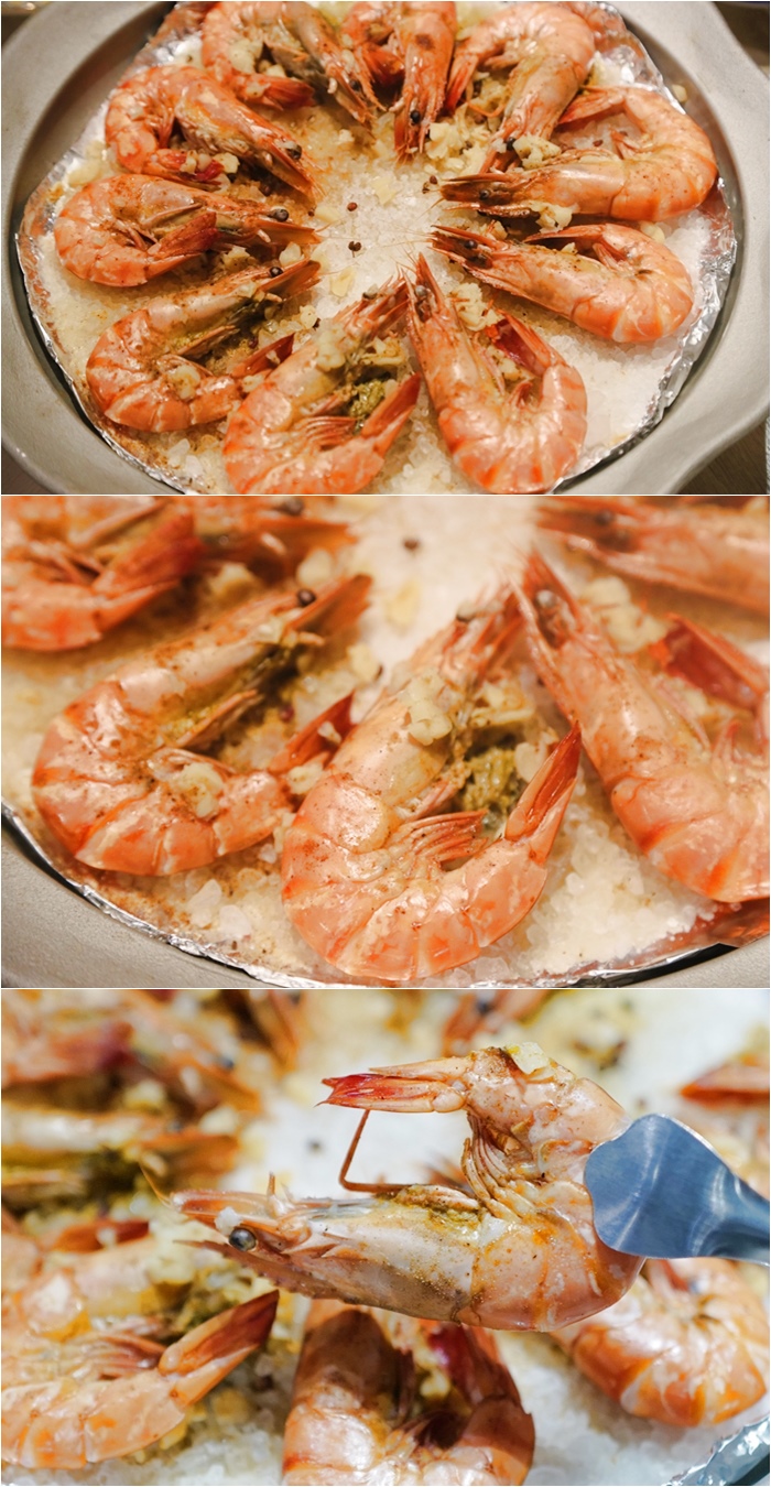 南部辦桌菜必備的陶板焗草蝦,新鮮的蝦子直接放在粗鹽上面焗烤,一隻隻紅通通的草蝦就出爐了,草蝦尺寸算滿大的,蝦肉彈牙緊實非常讓人著迷。 |