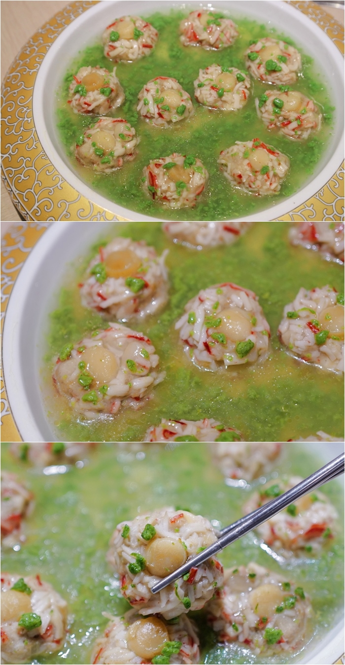 這道菜也很有喜氣,脆綠的感覺讓人生氣勃勃,一口咬下那干貝繡球,一股海鮮的鮮甜在嘴裡綻放,干貝的香氣加上蟹肉的鮮甜完全把層次提升上來。 |