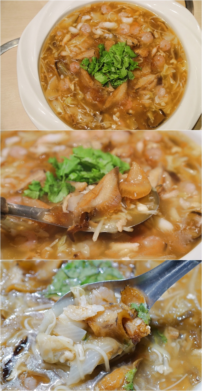 阿吉師的台式魚翅羹充滿了濃濃的古早味,真的很不錯,那入口兒子的回憶直接腦門,勾芡的剛剛好,不會太稠或太稀,加點醋提味更為鮮甜,大量大白菜熬煮的羹味很甜,加上魚翅、蟹棒、肉絲等配料,讓人欲罷不能。 |