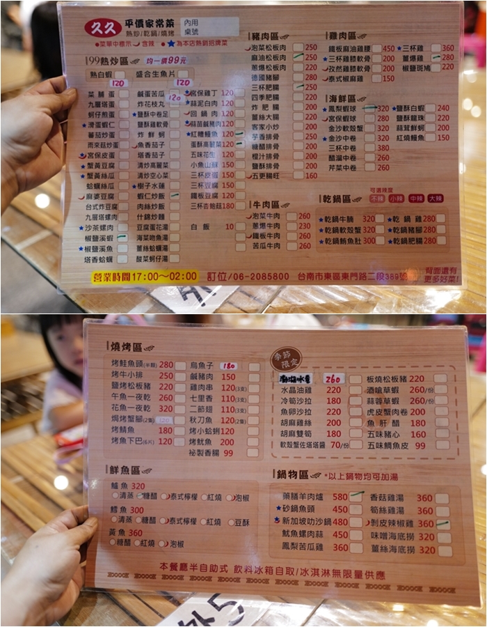 | 前面兩排全部都是99元,真的非常划算,菜單上除了熱炒以外,也有其他菜色都很吸引人,價位也都很實在,海鮮、鍋物、日式料理、串烤等應有盡有。 |