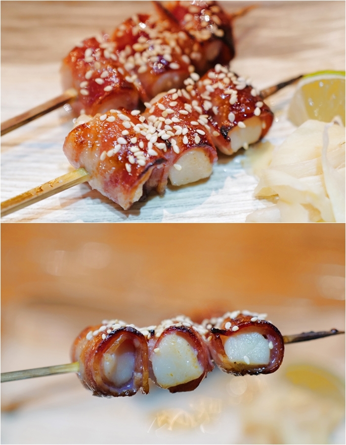 培根包裹著干貝還滿特別的,入口咀嚼起來培根香氣濃郁,搭配干貝的口感非常特別,還滿下酒的。 |