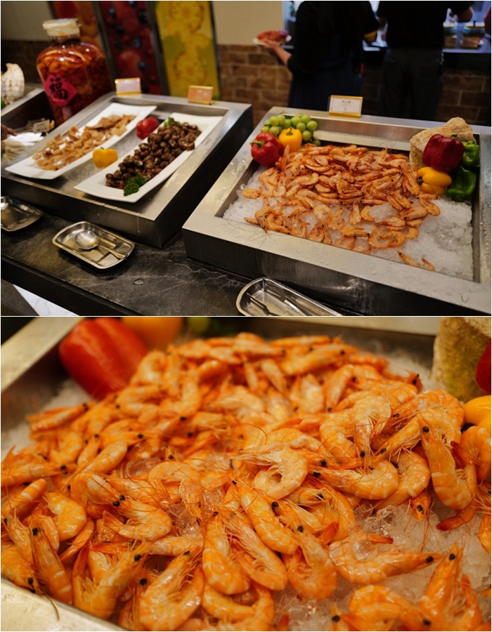 | 接著就是兵家必爭之地的海鮮區了,新鮮的川燙白蝦還有魷魚、風螺都是搶手貨,魷魚建議可以多夾,她們家的魷魚品質很好。 |