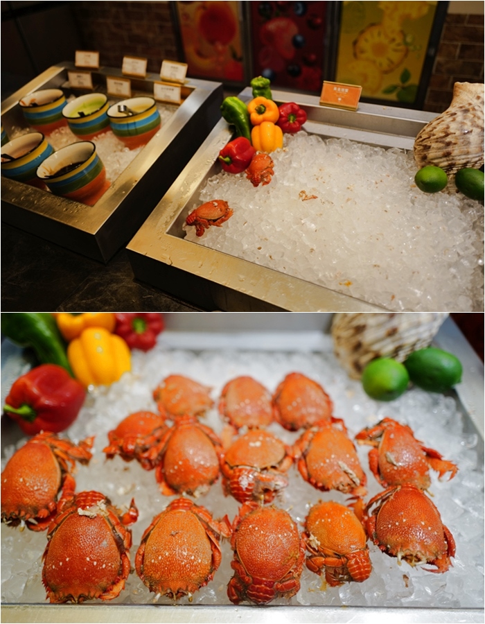 | 海鮮戰場區的螃蟹區被夾的速度非常快,一度懷疑嘉義人來萬國百匯唯一吃的就是螃蟹,每個人的盤子都是滿滿的螃蟹,不過萬國百匯捕貨速度很快,一下子就補滿了,提供的螃蟹目前是以旭蟹為主。 |