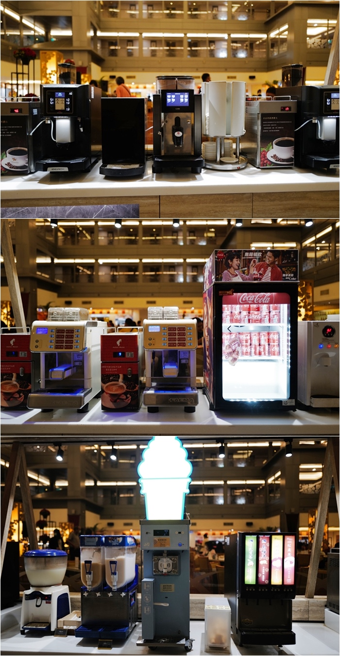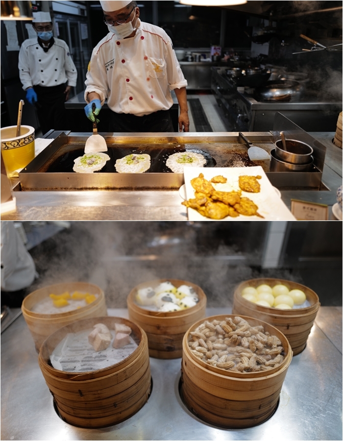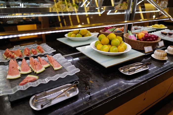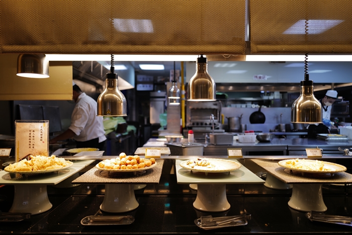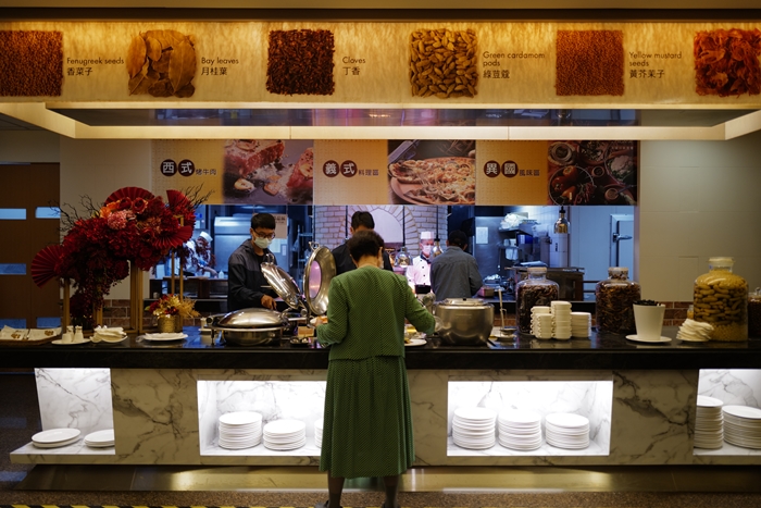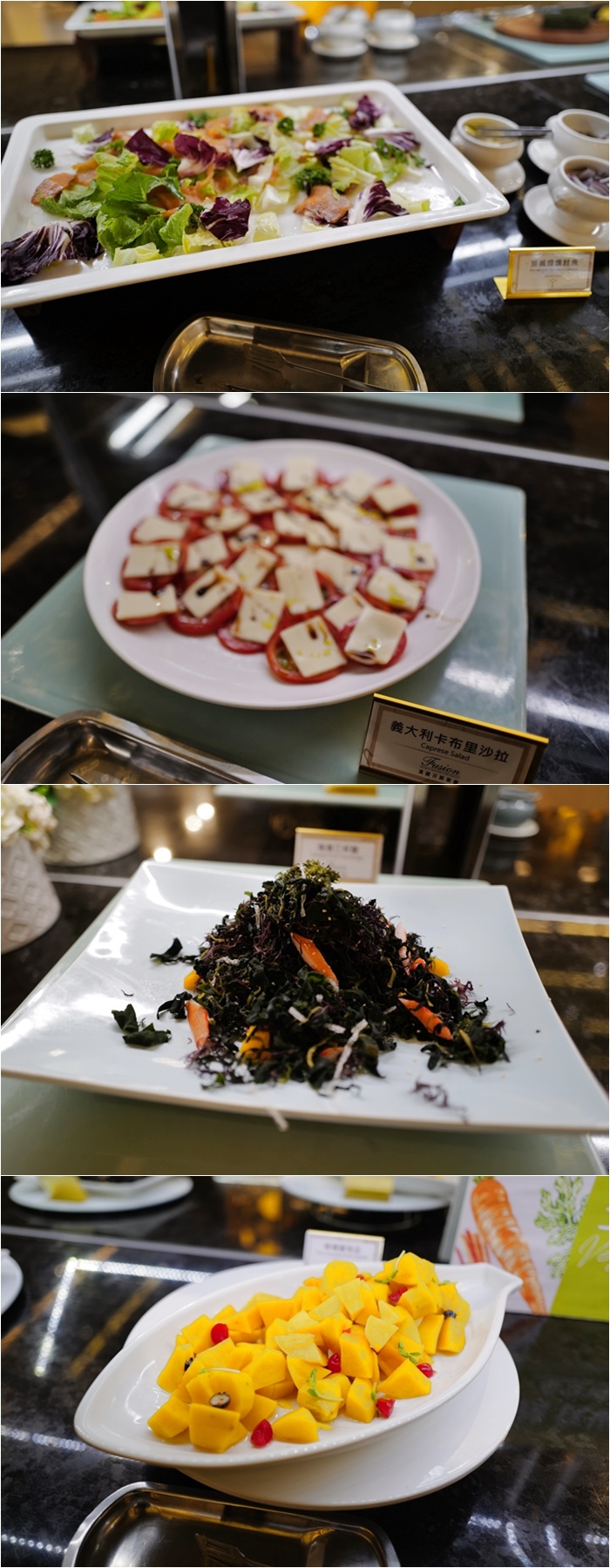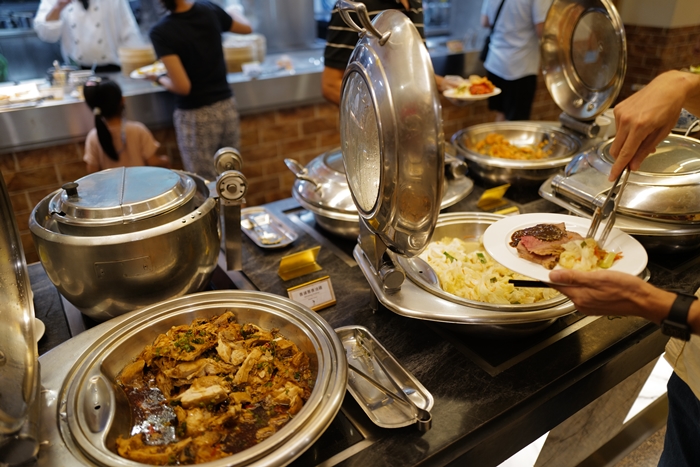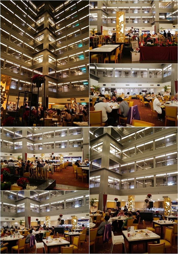 | 萬國百匯的空間超漂亮,是整棟大樓內部的中庭,挑高非常高,四周是客房樓層的玻璃走道,座位非常寬敞,食物坐落在整個廣場的四周,即使人潮很多也不會覺得吵雜,主要是空間挑高所以不會覺得壓迫。 |