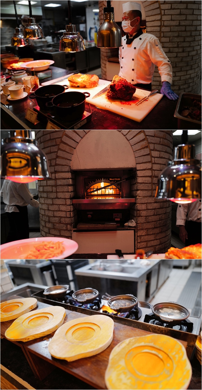 | 西式、歐式料理區最厲害的是耐廚房內窯烤爐,我想很多人在自助百匯的地方都沒有看過這個吧, 通常一座好的窯烤爐都是50萬起跳的,甚至還有百萬窯烤爐,所以在這邊可以吃到現做手工披薩一點都 不用覺得驚訝,造價不斐的窯烤爐烤出來的披薩就是特別美味,除了牛排,雲腿以外還有現做的蛤蠣湯。 |