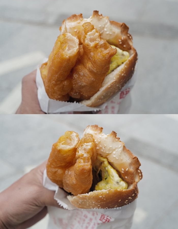 | 一整份拿在手上沉甸甸的,這樣的份量基本上很難一次全部塞到嘴哩,先抽出油條來吃上一口,非常酥脆的油條,真的很滿不錯的。 |