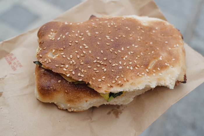 | 燒餅跟台灣的燒餅有點不一樣,鍾記燒餅感覺起來比較厚,較有麵包的口感,烤到外皮催脆也很可口, |