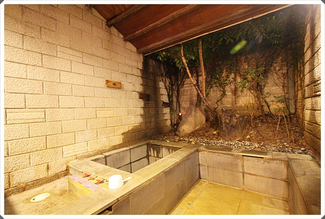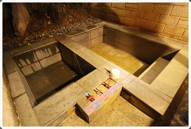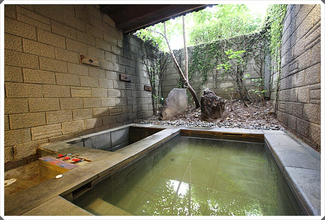 | 半露天的湯屋,一邊是溫泉水另一邊是冷水,當天又下綿綿細雨,泡起溫泉的感覺很棒,