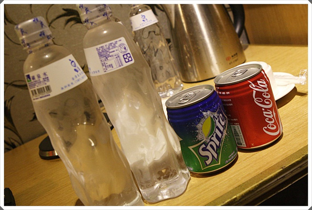 | 除了開水提供的兩瓶礦泉水,冰箱也有兩瓶礦泉水還有雪碧根可樂。 |