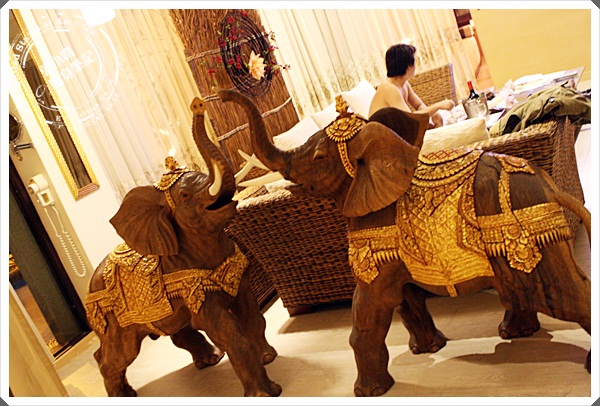 客廳旁邊還有放兩個木象的雕刻品,我已經脫光衣服等不及等等準備下泳池了,看電視中的我一一,
