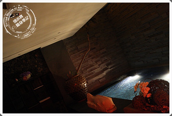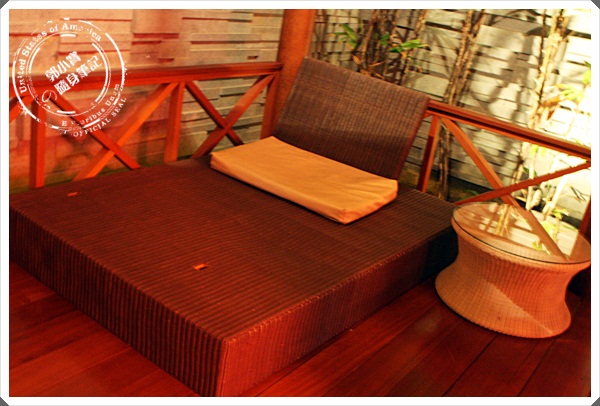 | 房間側邊拉門拉開後,就是泳池的發呆亭了,也是一樣竹編的,是南洋式的建築,泳池屬於室內型的,