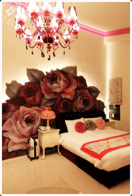 華麗的吊燈加上床頭櫃後的玫瑰花造景,真的還滿適合情侶入住的。 房間內也打掃得非常的乾淨,沒有任何的異味,棉被跟床單也可以聞到被太陽曬的香氣。