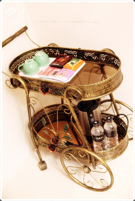 連放茶包跟礦泉水還有其他備品的地方還特別用仿古的小推車,非常的精緻。 床頭燈也散發出浪漫的氛圍。 這邊隔音也不賴,因為上我們電視聲音開大一點,再跑出去外面聽也沒聽到甚麼聲音, 而且晚上非常的寧靜,一下子就可以進入夢鄉了,加上床鋪滿軟的,所以就更好睡了。
