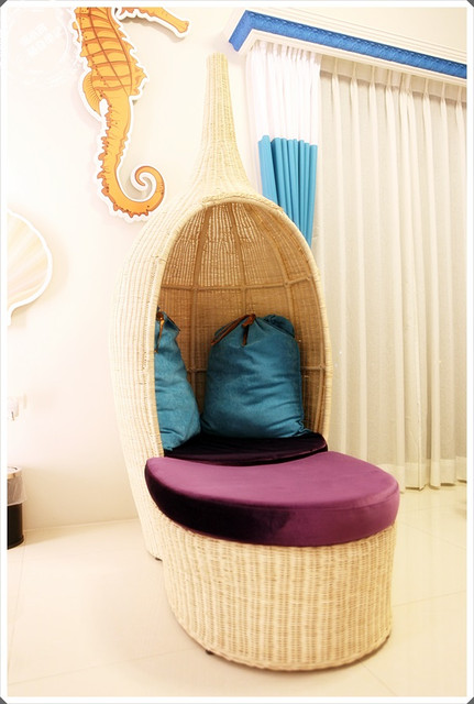 每個空間都是兩人房的空間,都有一張雙人床,進門就可以看到可愛的竹編遮棚椅。