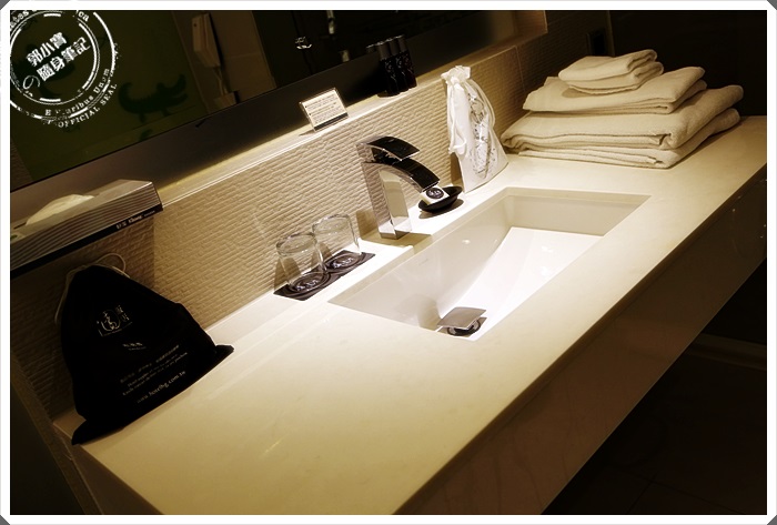 | 洗手台儲水槽也滿大的,浴巾根毛巾都堆疊在洗手台上,台上還有兩個束口包,一黑一白的。裡面分別是一些其他的沐浴用品跟吹風機,等等再拿出來跟大家分享。 |