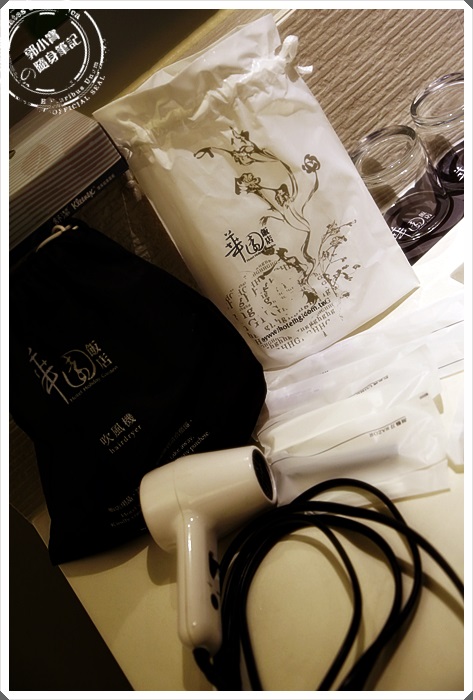| 白色跟黑色的束口袋打開來分別是牙刷、刮鬍刀等等的備品,令一個則是吹風機,別看華園飯店的吹風機小小的一隻,吹起來還滿好吹的耶@@ |