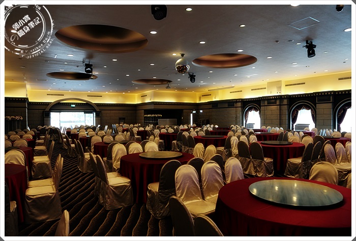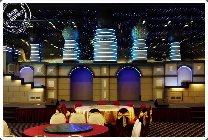 | 接著趁著等朋友整理行李下樓出發去玩的時候,我們還參觀了一下飯店,這邊是華園飯店的婚宴廳,據說訂的超級滿的,主舞台確實還滿漂亮的,目測大約可以容納40幾桌左右。 |