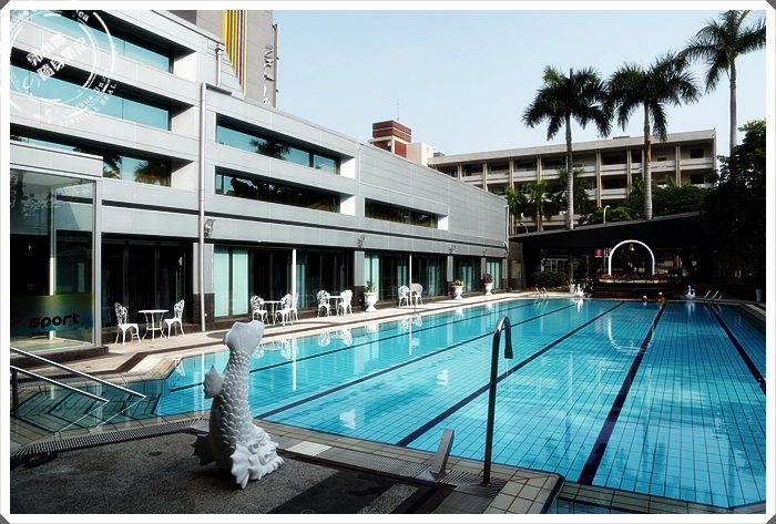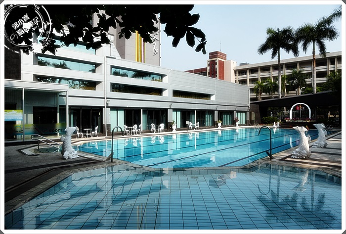 | 穿過婚宴廳後就是華園飯店的泳池了,泳池吧檯再另一端,華園的泳池在高雄是很有名的,是全年度衛生署每次抽檢飯店泳池的乾淨率都是第一名!!!! 而且重點沒有消毒水的味道耶。 |