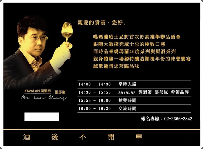 這次收到噶瑪蘭威士忌的邀請,我心裡面就非常的開心了,高雄鮮少有品酒會的舉辦,尤其又是國際級的調酒師跟我們一起品酒,那機會更是少之又少,噶瑪蘭威士忌,對我來說是非常陌生的,雖然金車公司這品牌對我來說,是我從小到大的就一路相伴的好朋友,凡舉飲料跟飲品無人不知,光是一個伯朗咖啡份量就很重了,近年來卻全心投入威士忌酒的領域。