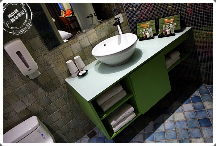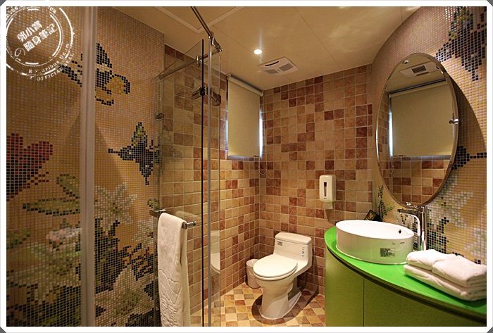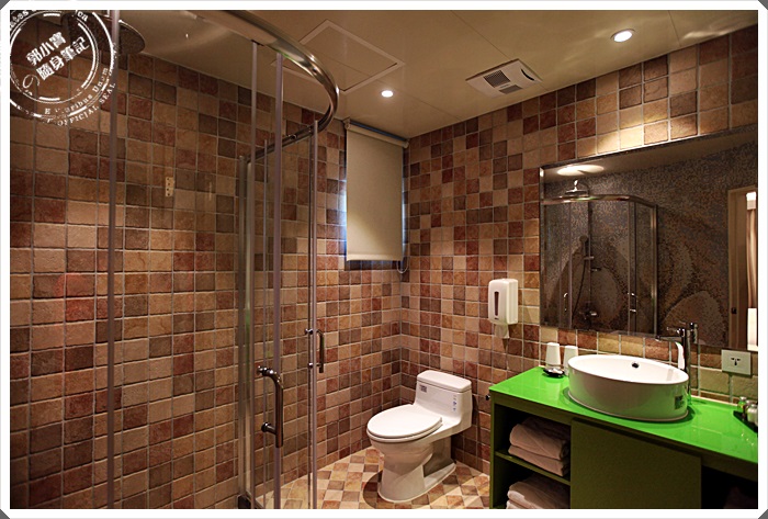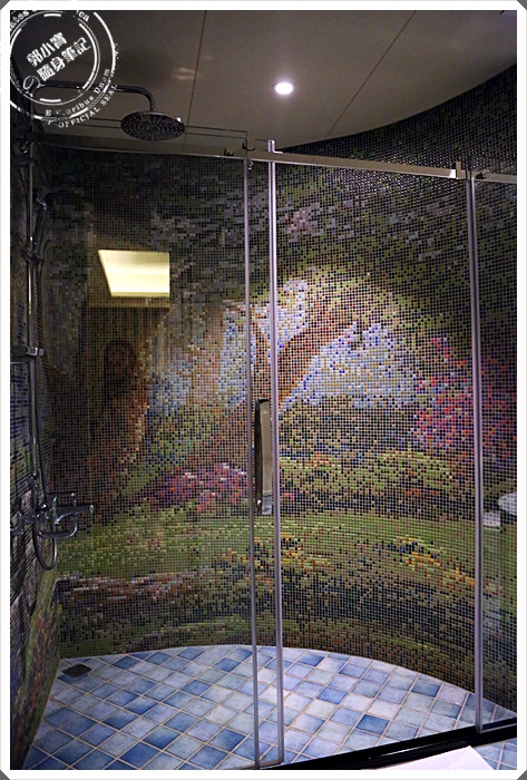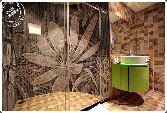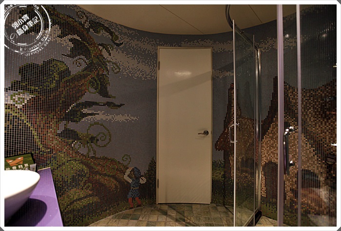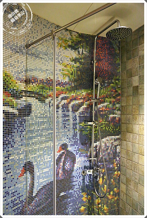 | 世奇商旅除了3D壁畫超有梗以外,另外一個最讓我驚豔的就是她們家的浴室了,是超厲害的馬賽克拼圖壁磚耶,我以前在家裡面就曾經想在浴室搞這個,但是問了一下價錢後幾乎嚇傻我了,尤其每間房間的馬克客磚畫都還不一樣,用小小的馬賽克磚一個一個拼起來真的超費工的,而且圖都還要先設計師畫過,這浴室給我的驚訝比彩繪更深刻,好玩的就現場看還要用心看才看得出端倪,但是相機一拍馬上就知道是甚麼圖了,真的超有趣! |