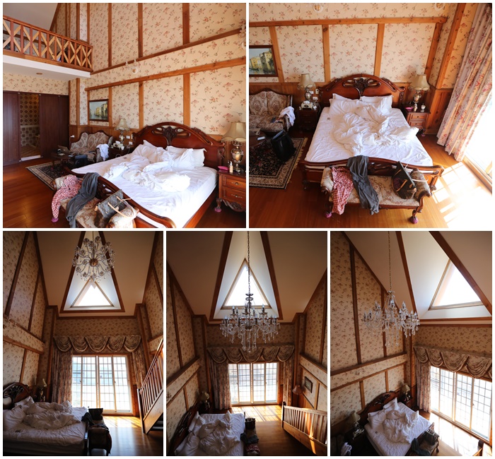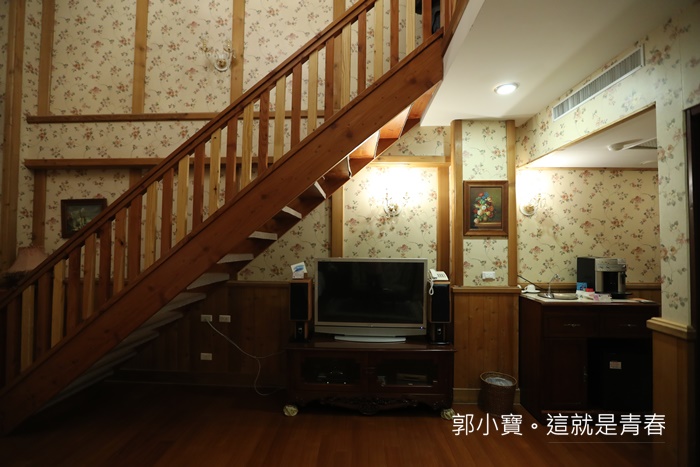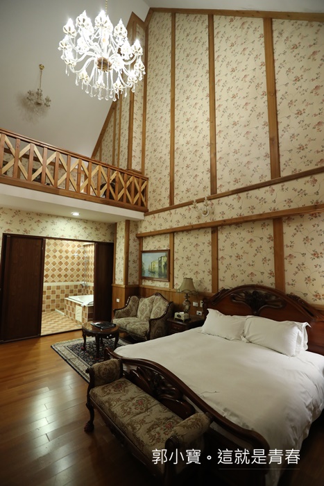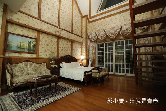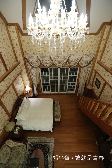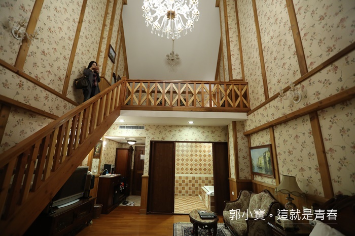 | 這間房型超大一間,挑空又高,旁邊的樓梯是通往樓中樓的地方,我躺在床上看著天花板就覺得好美,尤其吊燈華麗到一個不行,屋頂還有一個窗戶可以看到夜空,我們很喜歡他們家挑選的壁紙,一直喊著以後也要去裝潢成這樣的風格。 |