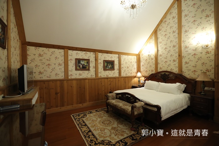 | 華麗古典的大床,床架也是原木雕刻的床架,讓我意外的是他們的床墊跟棉被都讓我很滿意,因為清境算是比較高山的地方,之前有些民宿的床一躺上去都有點潮濕感,棉面蓋起就是有感覺到濕濕的,但是他們家的棉被一蓋起來就是舒適乾爽,床墊很好躺,不會太過於軟綿,睡起來後不會腰酸背痛,超推薦! |