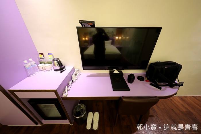 | 房間一角的書桌架是木工裝潢一體成形的,這種紮實的木工作法現在不常見,現在的很多商旅都是直接買書桌或是衣櫃來強調出設計感,但是我就是喜歡這種一體成型的木工師傅打造出來的,書桌的空間算是滿大的,。 |