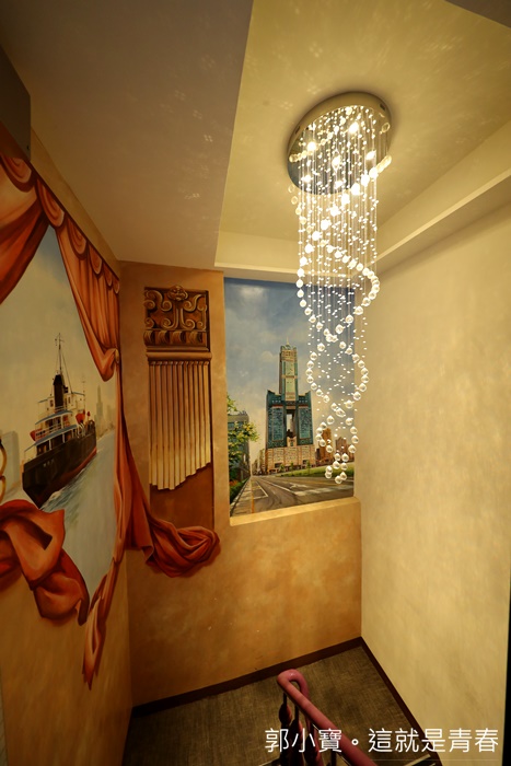| 隔天起床要去用餐才發現,差點忘記拍它們一樓通往二樓的超美麗的吊燈,即使是樓梯的空間也裝潢得很漂亮,牆壁上的壁畫是高雄著名的八五大樓跟高雄港,處處都可以看到高雄的美景。 |