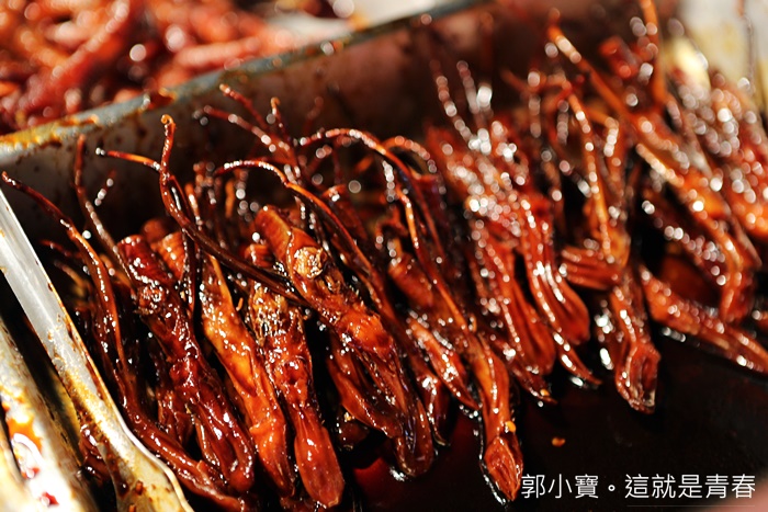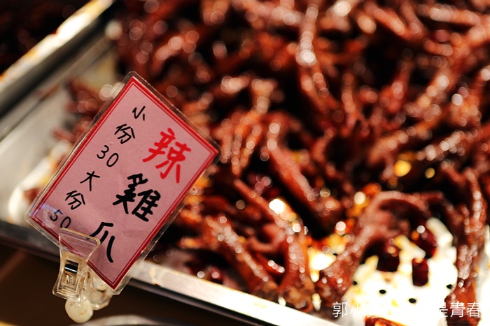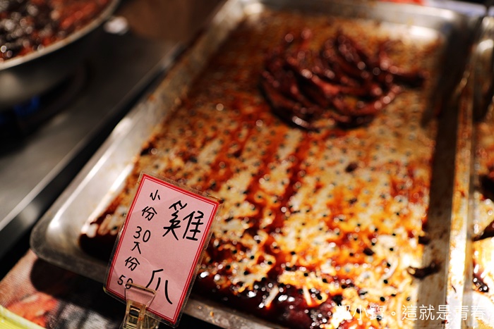 | 架上永遠都很孤單的雞爪,這真的太誇張的,每次一起鍋就被夾光,價位也真的非常便宜,大分的雞爪也才50元就一大包,而且還是現滷的,經過的時候就可以看到阿明哥攤販旁的一個大滷鍋永遠都在滷著雞爪。 |