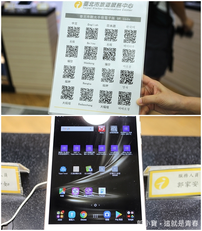 | 在旅遊服務中心除了有很多各國語言版本的宣傳手冊跟觀光手冊以外,還提供wifi的服務,話說台北真的是一座很友善的城市,幾乎整個台北城都有免費的wifi可以使用,如果妳不想要書本的紙稿也有手機app服務,直接掃描就可以進入各種語言版本的台北介紹。 |