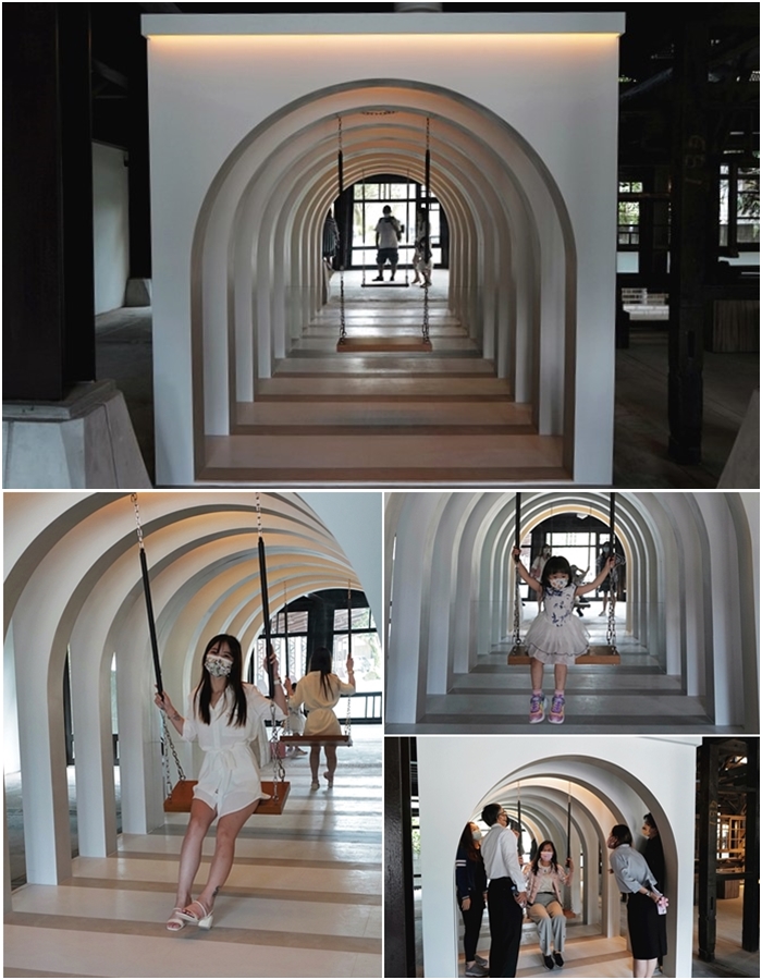 以多層拱門打造時光走廊,延續整體空間的極簡設計,以隱喻的方式打造在此遊蕩於現代與歷史交會之中的意涵,燈光將隨著人們坐上鞦韆,進行不同變換的燈光展演。 |