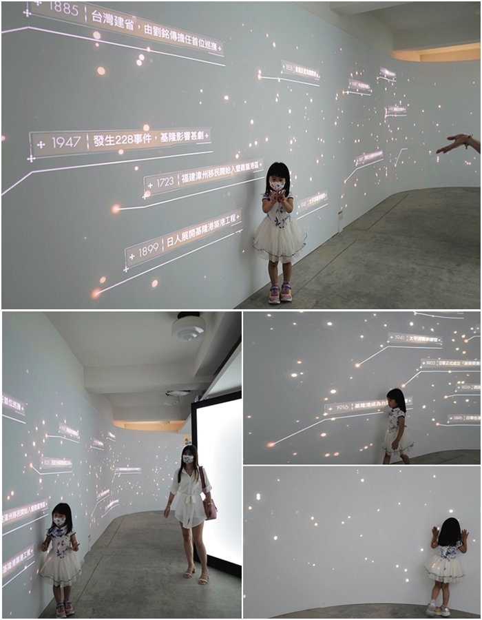 | 在這星光點點的空間不只感受它的虛幻美地,更可以了解整個基隆的歷史,用星空作為視覺概念,匯聚成基隆事件的時間流。從古至今綿延不斷的歷史事件,是養育基隆發展、浸潤基隆文化的重要元素。此區將基隆歷史重要事件的年份,以潮汐湧現的方式,表現在整個時光的流動中。 |