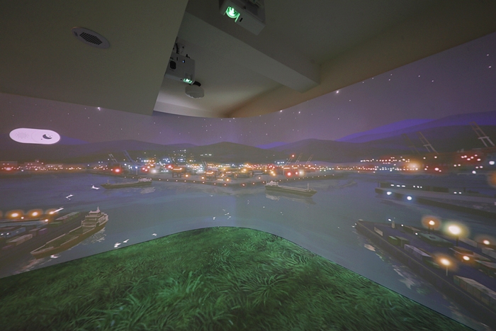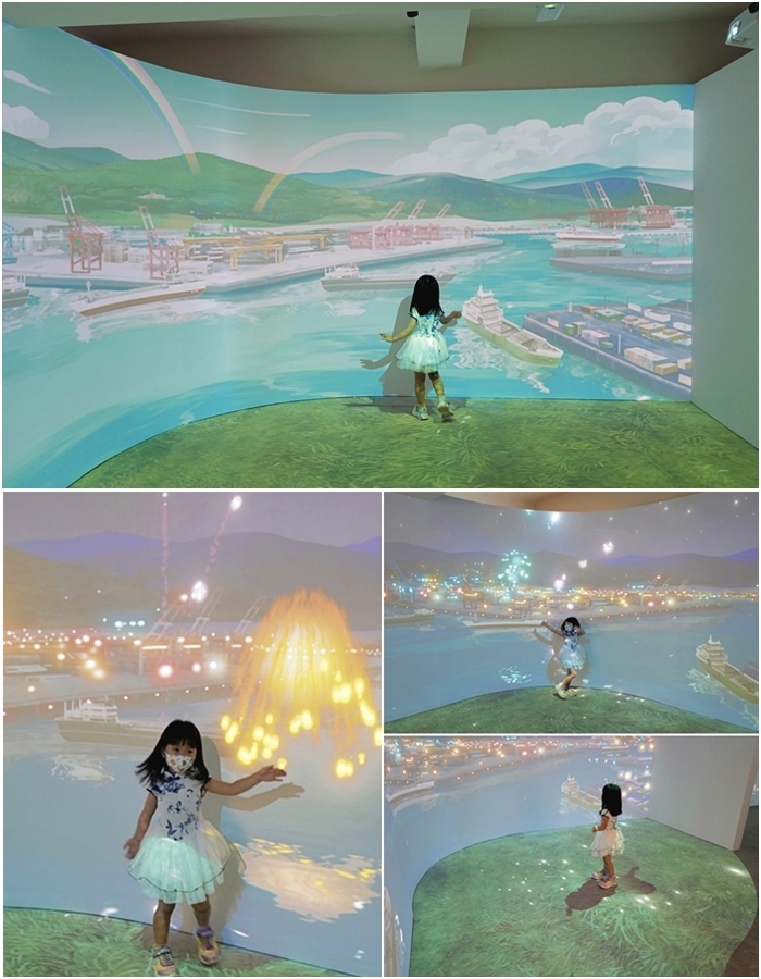 第二個空間基本上就會讓小朋友玩瘋,這互動光影真的很好玩,揮揮手就可以變化白天夜晚,畫面模擬於旭丘指揮所俯瞰之基隆港畫面,在白天的時候揮手就可以看到港灣一座座彩虹,在貨輪的船體上揮一揮也會瞬間裝滿貨物離開碼頭。