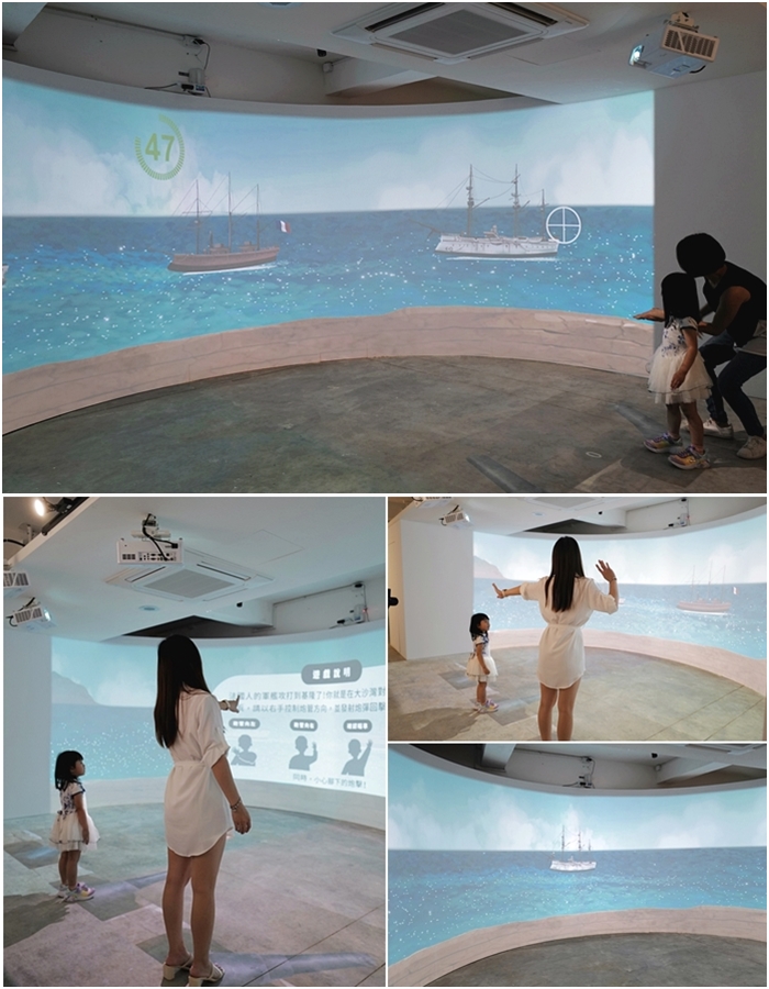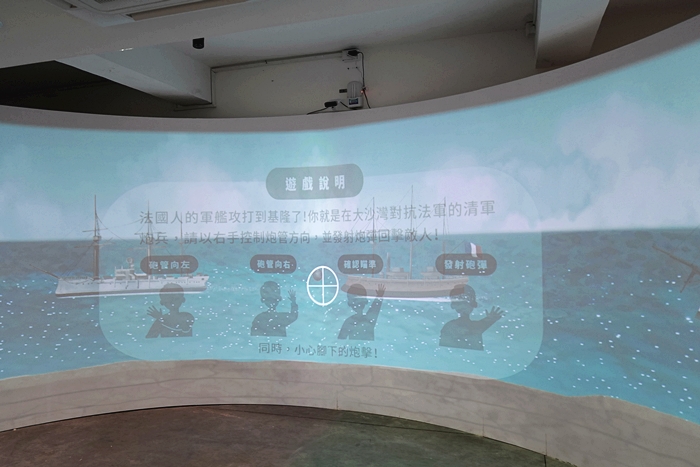 | 大沙灣砲台體感互動,模擬1884年清法戰爭中,法軍戰艦駛入基隆對大沙灣砲台開砲,清軍於基隆炮台回擊之畫面。觀眾可藉由身體動作操控大砲射擊,攻擊海上的法國軍艦,親身體驗當年的戰事。 |