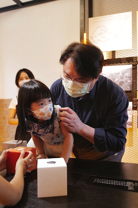 | 除了環境布置以外,還有桌上分別將不同的產業環境盒子放到音響中間,就會感測到不同產業播放出產業的原音重現,還可以聽到基隆漁港內魚販子在喊魚的聲音,凌晨崁仔頂魚市的叫賣聲,真的太有趣了,途中還遇到基隆市長林右昌先生也剛好造訪這邊,還跟我們家小朋友互動了一番,市長本人非常親切有禮貌。 |