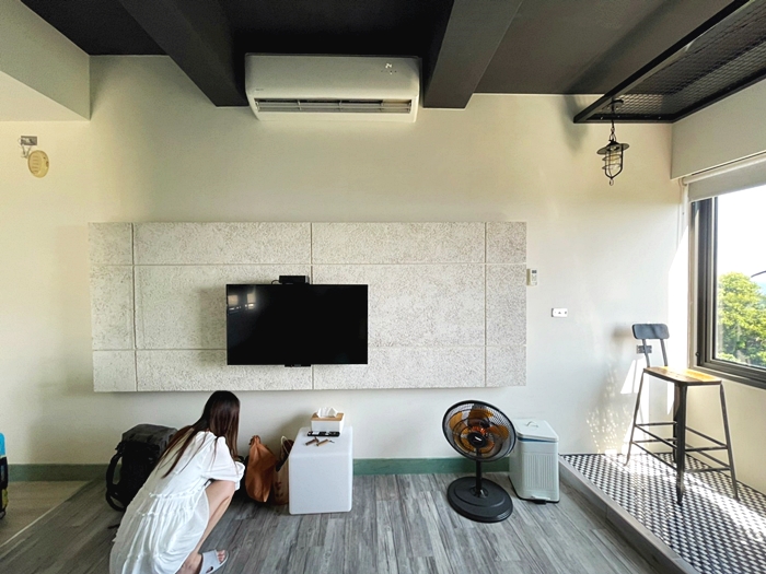| 房間另一邊就是電視跟冷氣,冷氣對著頭吹涼的很快,但是都會吹到頭有點不舒服,房間沒有太多陳設物,所以很多堆行李箱。 |