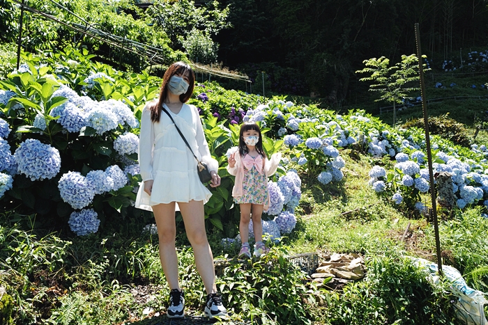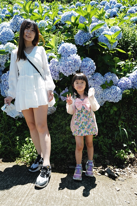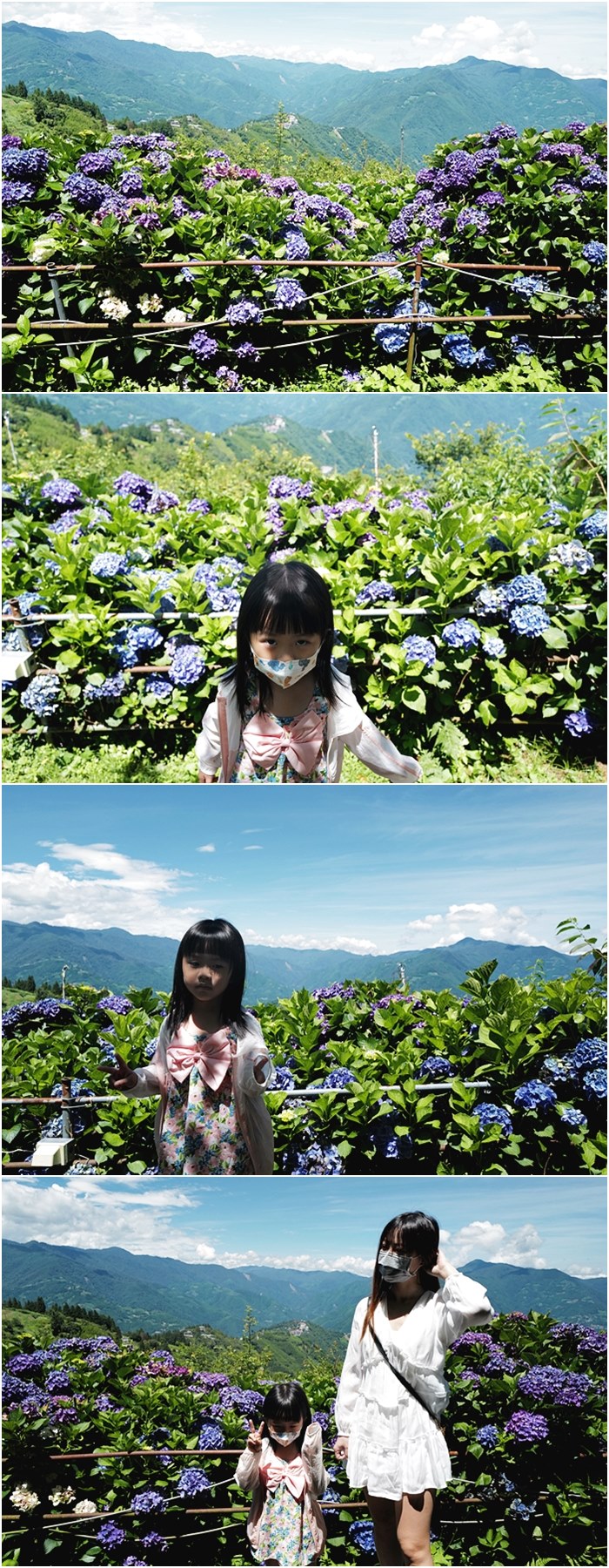 | 一整面平台的繡球花真的好美,且拍照還可以搭配後方的山景跟藍天白雲,可惜當天的時間拍照剛好太陽會刺眼睛,看看我家兩位主子的屎臉就知曉一二了。 |