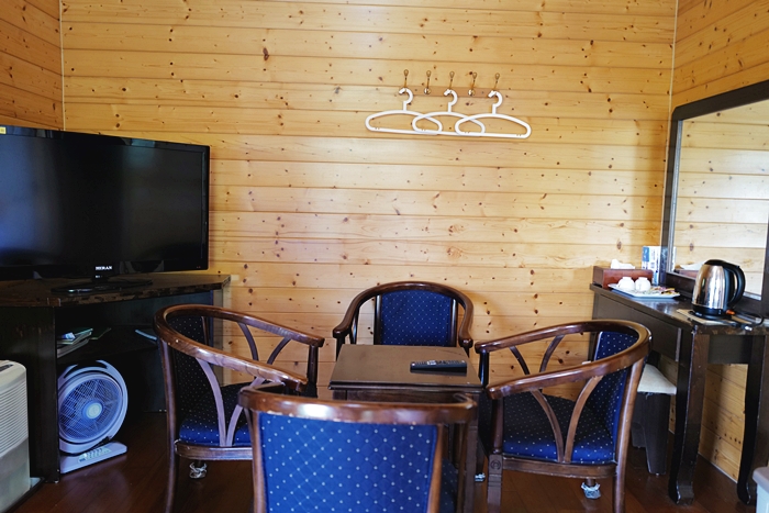 | 簡單的小客廳有桌椅,晚上泡茶聊天也都很不錯,山上的天氣很冷,所以都有提供電熱毯,之前冬天上來拉拉山差點冷死,但是有電熱毯真的好舒服。 |