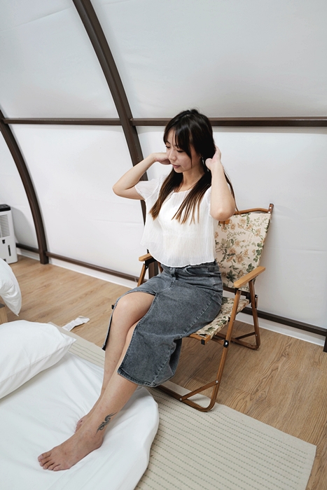 | 帳篷外還有露營桌跟躺椅,坐在上面好舒服,這邊剛好還有風,即使坐在外面也不會覺得悶熱,真的很愜意,這邊聊天非常棒。 |