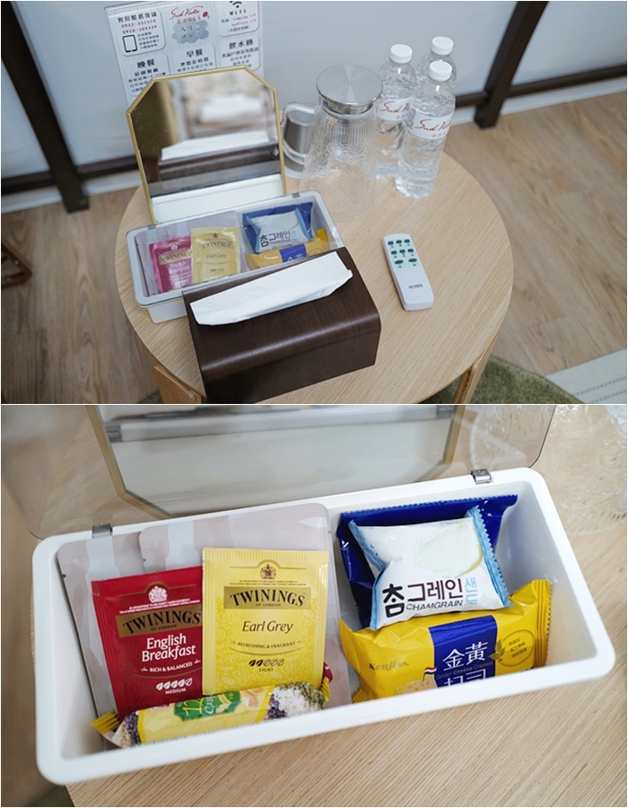 | 一旁的小桌子有提供備品跟礦泉水、茶包、咖啡包等,另外還有小零食,飯店民宿有的這邊也幾乎都有準備。 |