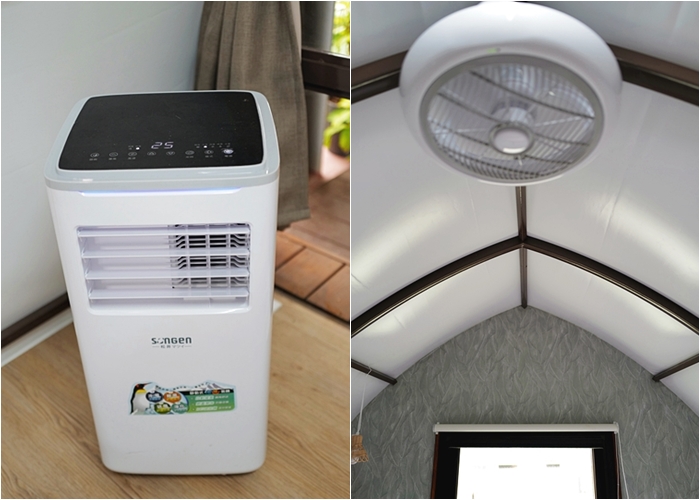 | 擔心夏天會熱的朋友也不用擔心,帳棚內有一台移動式冷氣搭配吊鼎的循環扇,即使是大夏天還是涼涼的。 |