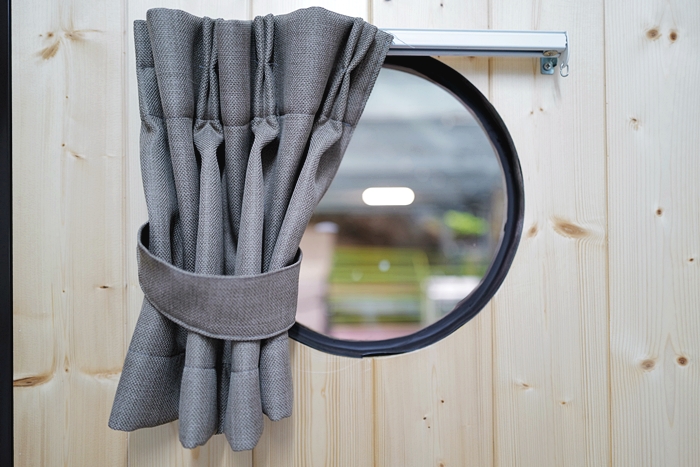 | 前方透明玻璃當然也會有窗簾可以遮蔽,連門上的小圓窗也有專屬的小窗廉,可愛極了。 |