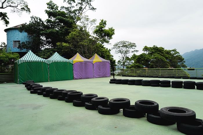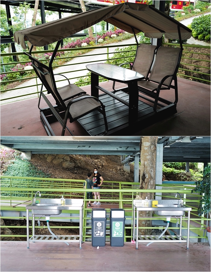 | 房間外面就有一台搖椅,女兒吃點心都說要坐在上面,玩得很開心,帳篷前方就是垃圾桶跟共用洗手台。 |