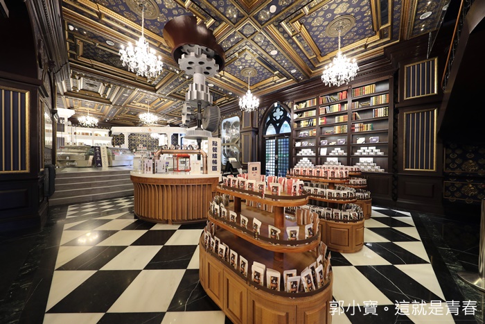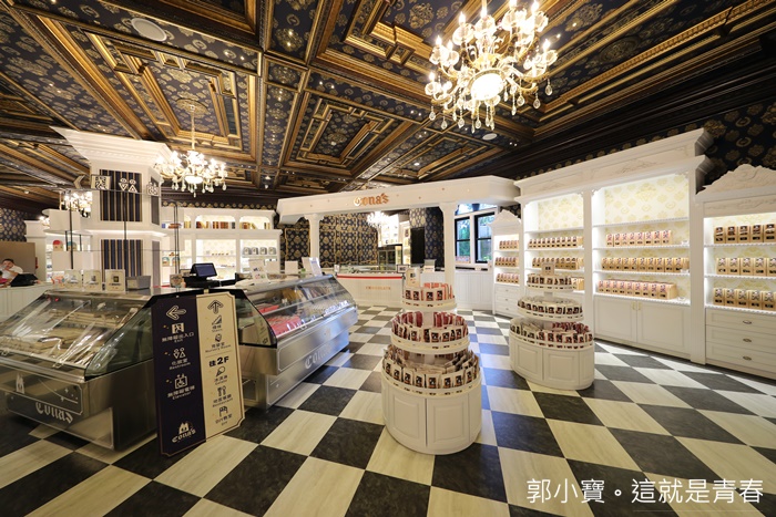 | 一樓的大廳非常的大,一樓主要都是商品部,販售妮娜的巧克力相關商品為主,這根本也太美了,不管是吊燈還是壁紙都挑選的超漂亮的,就連男生也會少女心大開,彷彿走進了歐洲古典城堡般,就差了一條紅地毯了,我喜歡他們黑白方格相間的地板,帶點歐式復古的氛圍,挑高的高度還滿高的,所以人潮多一點的時候並不會感覺到很悶也不會有太吵雜的回音。 |
