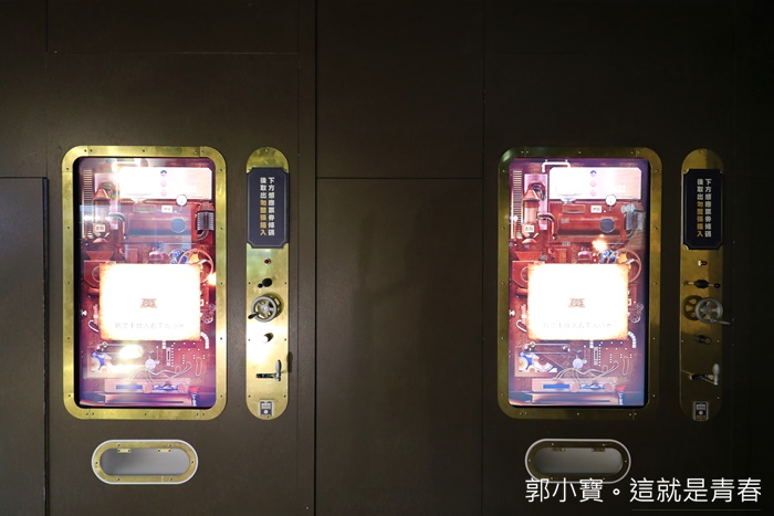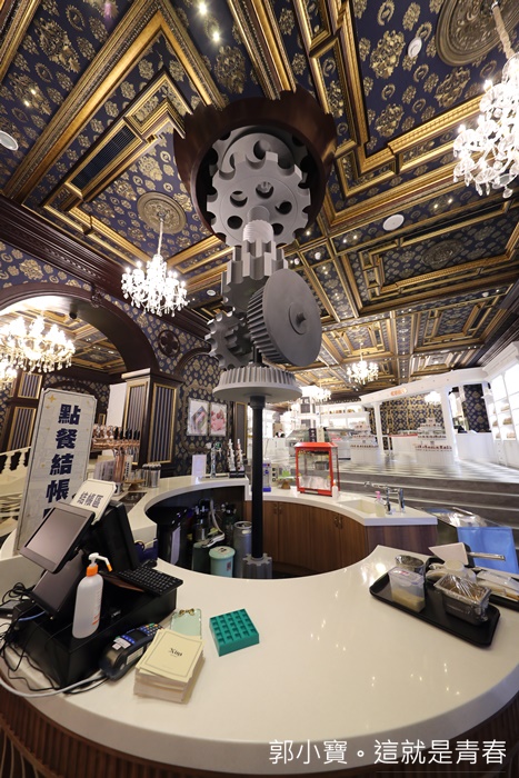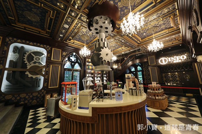 | 巨大的齒輪立柱滿壯觀的,還有一旁古銅色的鐵管應該是飲料吧檯販售飲料,真的還滿有趣的,旁邊的玻璃牆面裡面有巨大的玻璃齒輪櫥窗,看起來真的都很壯觀,感覺來了一個古老的奇幻城堡,讓人流連忘返的美景,現在是準備要進入哈利波特的世界了嗎XD? |