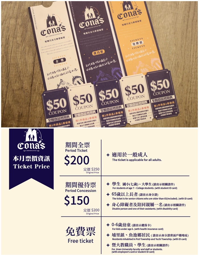 目前妮娜夢想城堡門票有三種,分別是全票、優待票、免費票,只要你是正常人基本上都需要買全票,六歲以下兒童與埔里的居民是免費票,65歲以上的老人則是優待票,票價的部份全票原價是250元,但是會因為廠商長期做不一樣的活動也有不一樣的折扣,不管你購入的是多少價位的門票,全部都會拿到250的折價眷。 (活動及票卷還有任何最終解釋權請看官方粉絲團 妮娜巧克力夢想城堡)