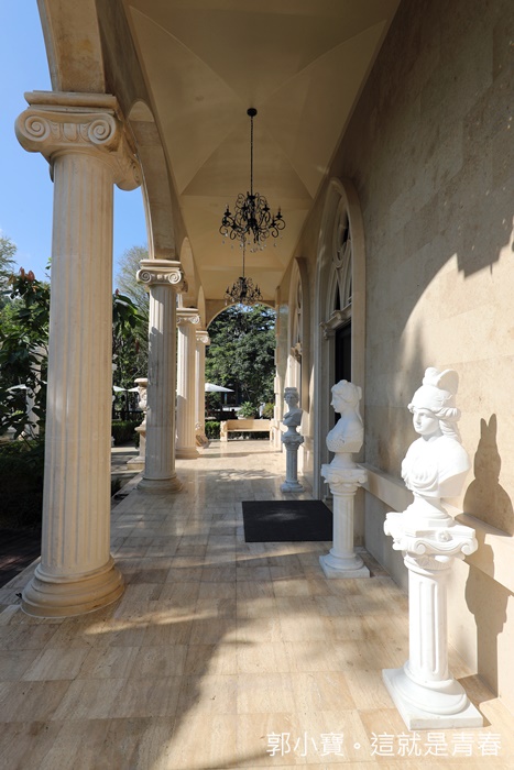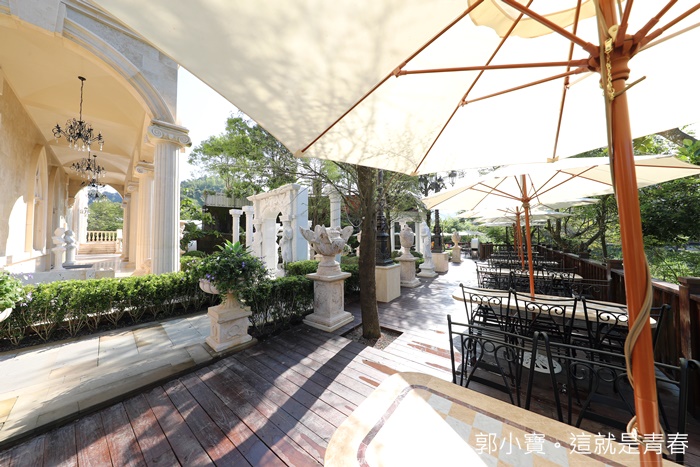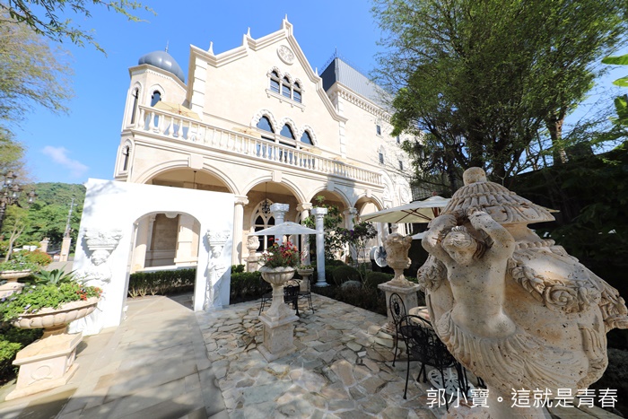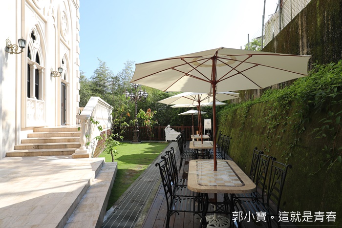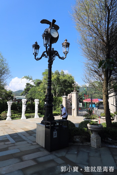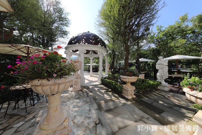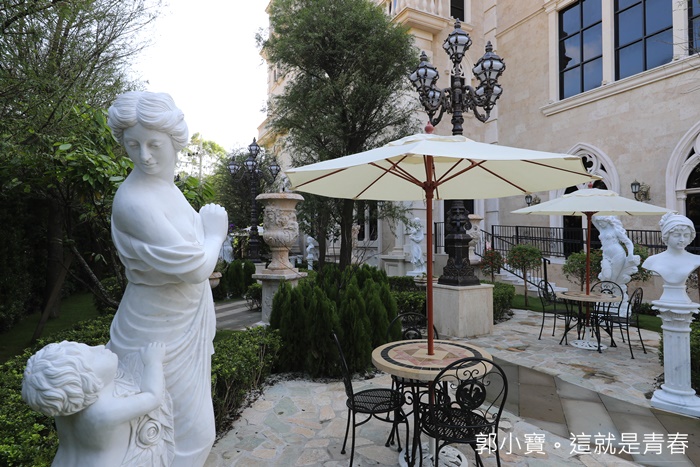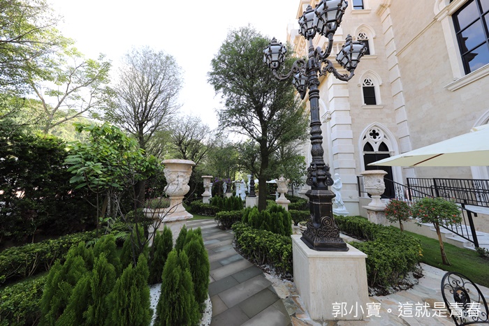 | 後方的園藝造景也很漂亮,整體搭配起來的景色就是超美的,地磚也鋪的很漂亮,旁邊還有一個圓形小亭,上面圓蓋是仿舊色鐵件雕刻非常有感覺,帶點文藝復興的歐式建築我好喜歡,非常好自拍的地方,不管從哪個角度拍照都讓人超愛的!! |