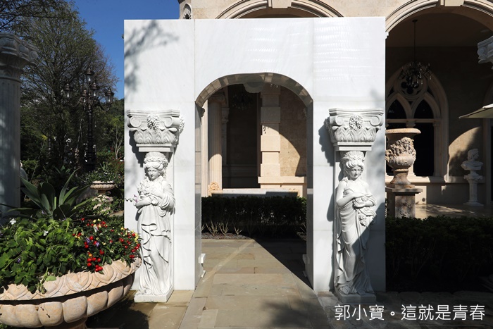 | 打造妮娜夢想城堡花了不少年,建材也都是從歐洲運回來,光設計圖還有建地、環評等等的一切都花費了不少心血,園區的佔地並沒有特別大,但是建築本身跟園藝的空間真的規劃的很細心,進入妮娜夢想城堡需要購買門票,光從門口前的石雕搭配大門就可以看到氣勢,周邊鄰近紙教堂,所以這附近的停車位真的沒有很多,假日去玩的話可能會比較麻煩,附近有幾個付費停車場。 |